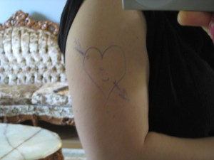 Somewhere around the eyes or mouth was the actual required mark. The rest was his way of getting back at me for snapping at him. It was really cute but more than half of it showed when my tshirt sleeve was down, and since I was running late I had no time to spare to start scrubbing the ink off. I had no choice but to go and do my workout with this “tattoo” on my arm.