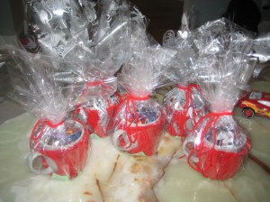 That was about where I crashed last night. This morning I filled each mug with gourmet truffles, tucked in a Tim Horton’s gift card, slipped a little gift card with care instructions underneath (the green bit you can see peeking out from under) and wrapped it in clear cello-wrap.