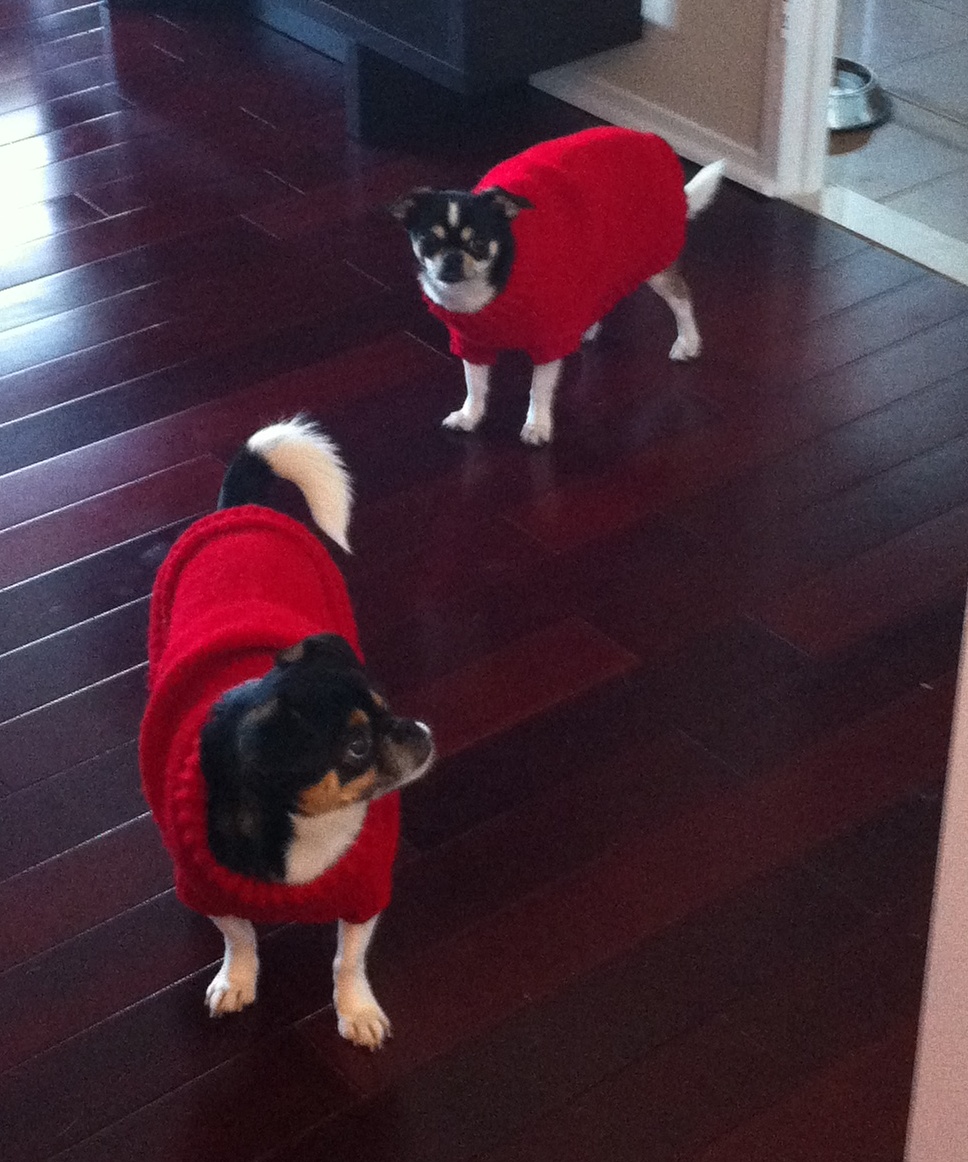 I forgot to mention that I got a photo of those dog sweaters being modeled: