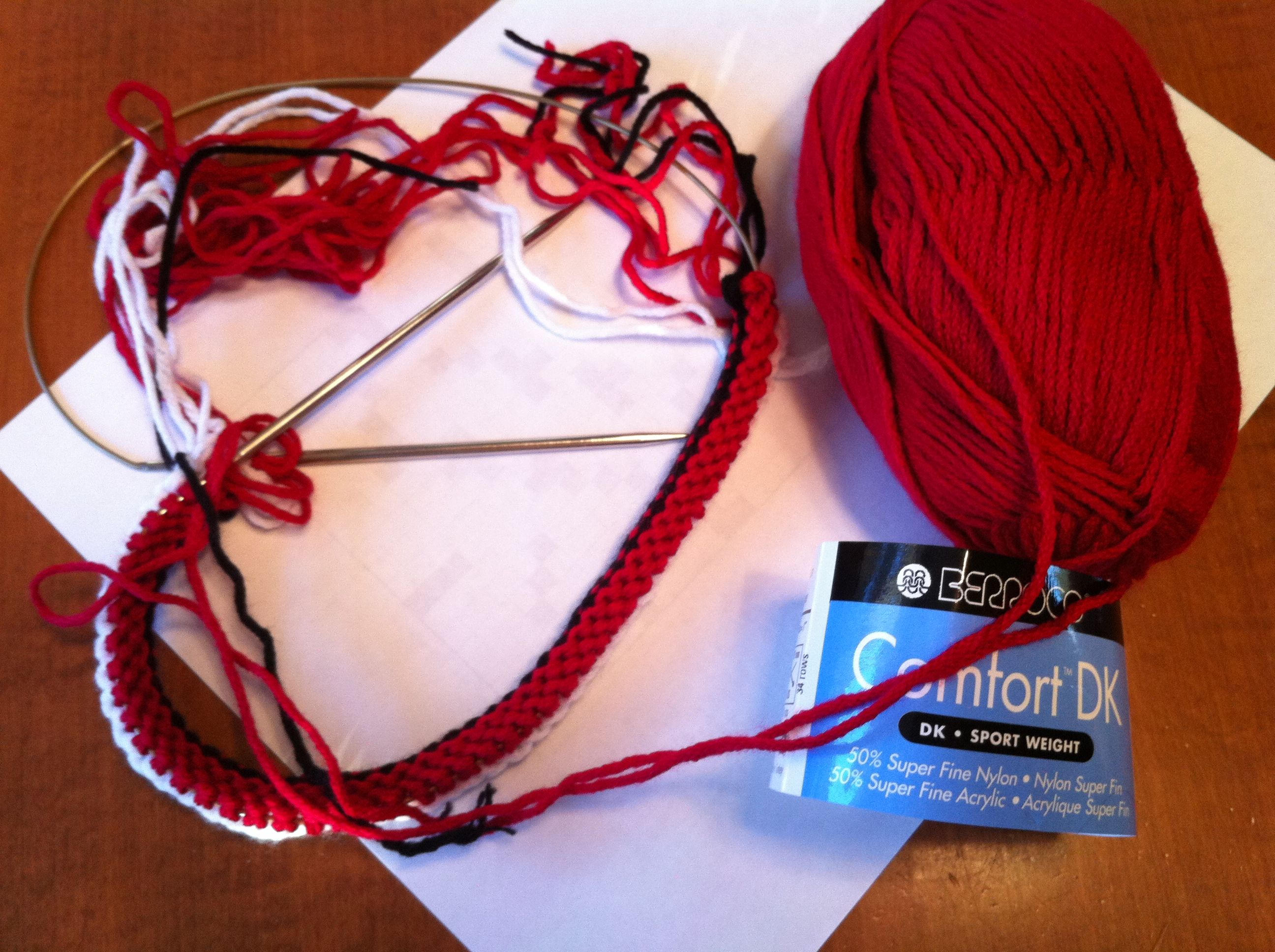 I started with the white, and a 3.5mm needle. So far so good. I moved on to the black; still working great. Then I threw in some red and came to a screeching halt. My red wasn’t red. I thought it was red, but it wasn’t red. It was very-dark-almost-red-but-just-a-little-too-pink-to-be-actual-red red.
