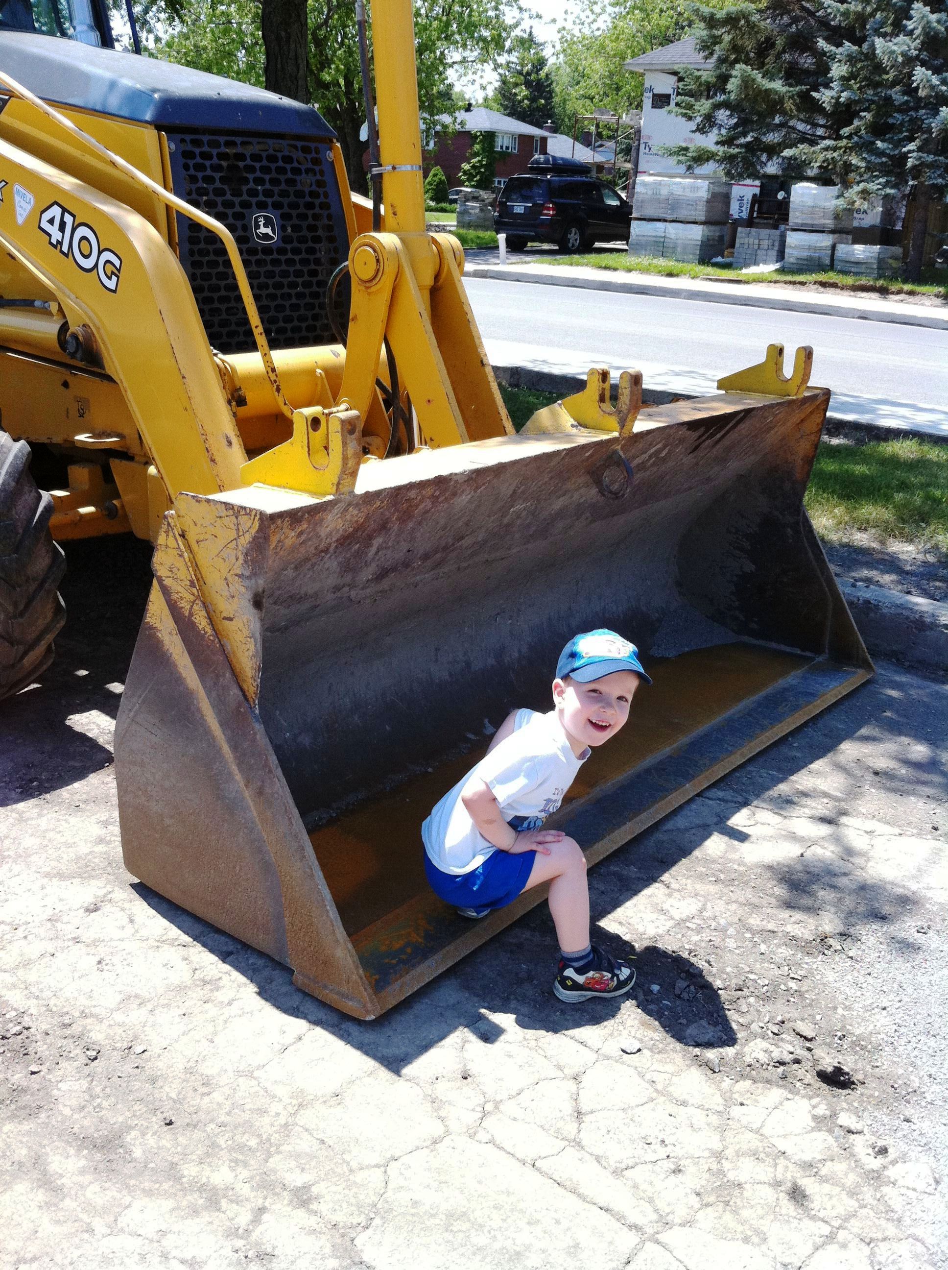 And COMPLETELY unrelated, here’s a pic of Jakob posing with his favorite vehicle. (What’s it called, by the way…back hoe?) We went to the dep for freezies on Saturday and they had one parked in the lot, and he was SO excited to get a chance to get up close and see it.