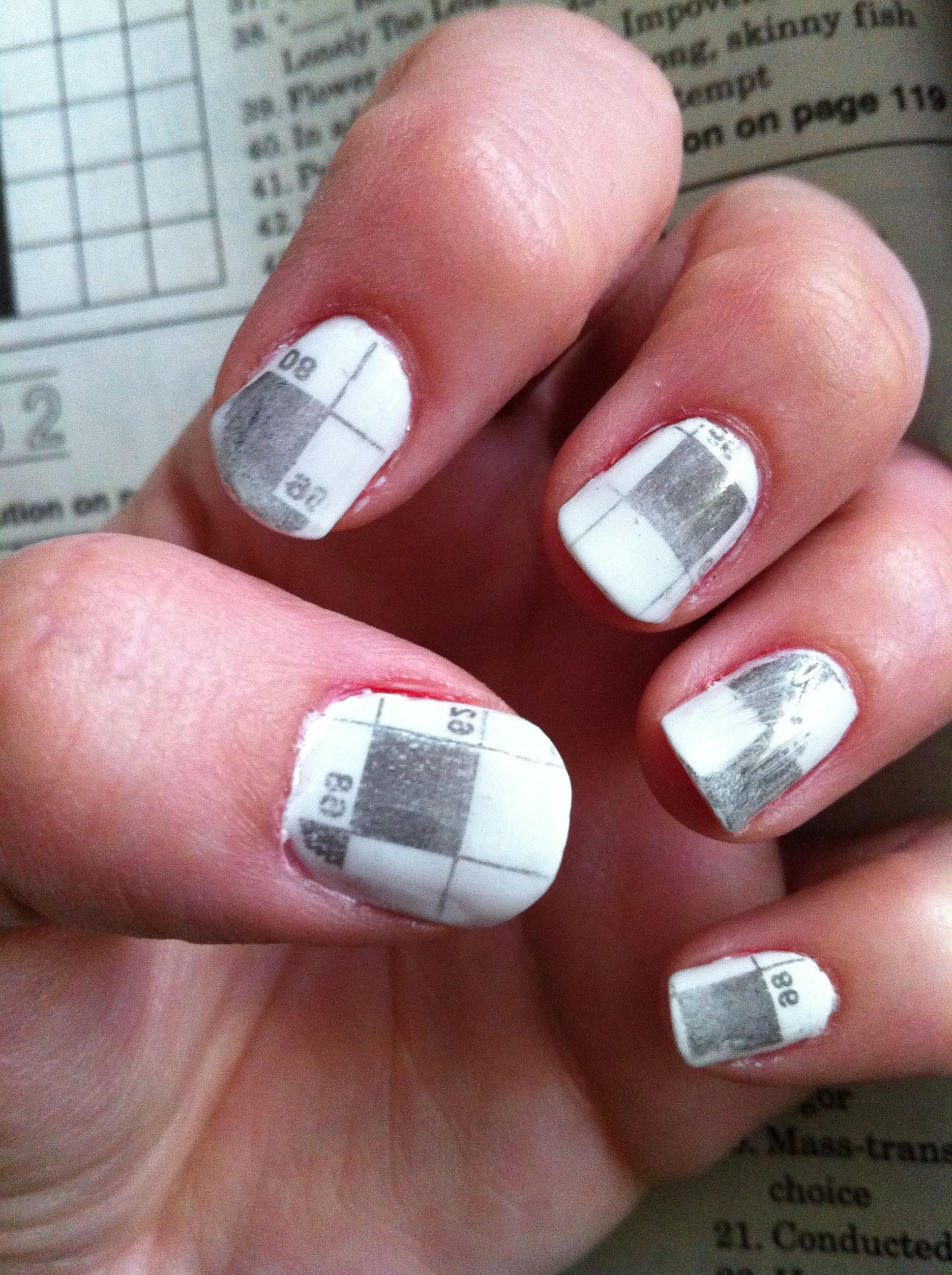 These were my nails last week. I’ve seen the “newspaper nails” technique online in various places but when I tried it I decided to use the crossword puzzle instead. 🙂
