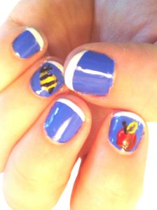 Today’s themed manicure is for the current Jewish holiday- Rosh Hashana- the Jewish new year. The Israeli flag is white and blue, so I went with those as main colors, only I reversed them. (The flag is mainly white with 2 blue stripes and a blue Star of David). On this holiday we eat and serve slices of apple with honey pots for dipping, as a way of starting off the new year on a sweet note (to foretell a sweet new year). So I used nail polish and a toothpick to paint a bumble bee (for the honey…though now that I type this I’m wondering if bumble bees are actually the honey producers…drat), and an apple.
