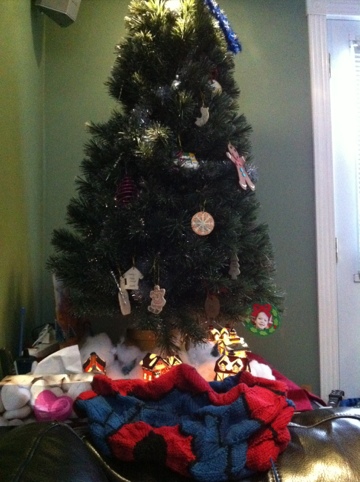 Knitting away on Henri’s Spidey Blanket (yes, the one I started July 23rd 2009, shaddup) by the Christmas tree like a good little Jewish girl while I wait for my mom to come babysit and Maaike to pick me up so we can meet Yannick at Colette’s studio so I can get a LOOM!