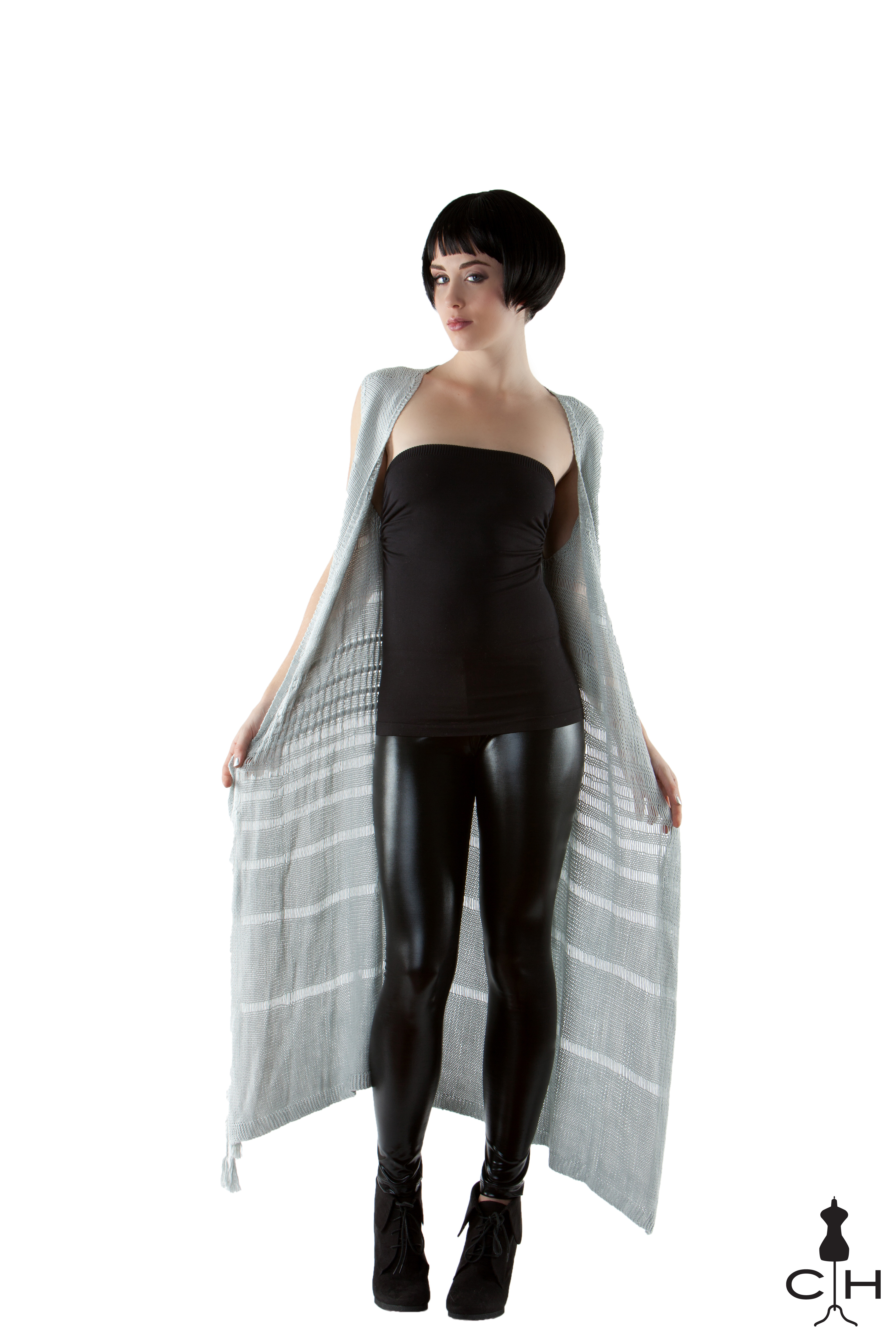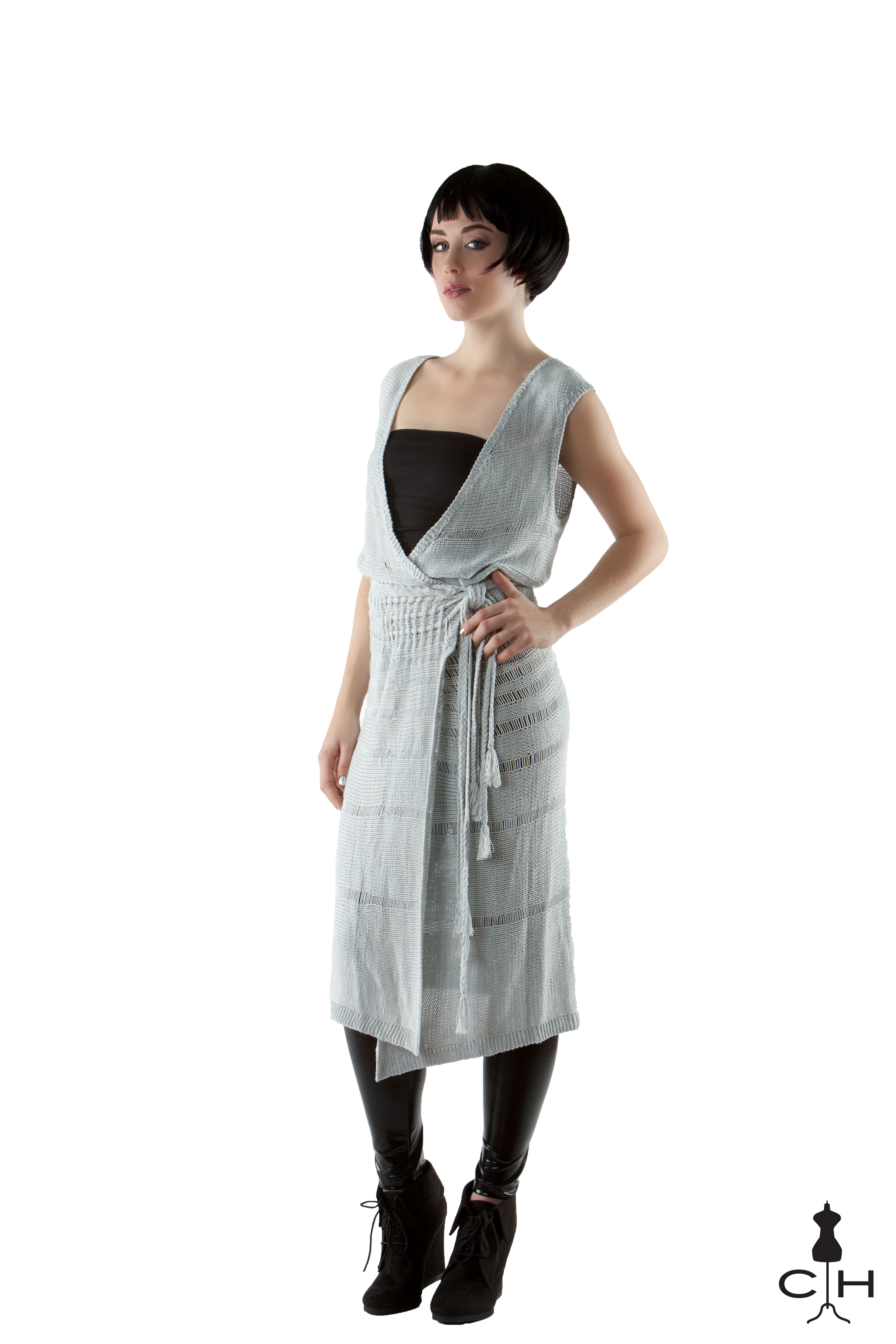 Cadmium is a dress/layering piece, sleeveless with 4 integrated belts actually woven through the runs created by dropping stitches. It’s knit from side to side and the only seams are to close the tops of both shoulders.
