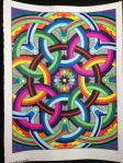These two are both from the stained-glass book I mentioned above, which is also by Mindware and is called Tesselights. The top image with the rings was colored somewhere between 2013 and 2014, with crayola fine-tipped markers, while the lower one was colored November 22 2015 with fine and ultra-fine tip markers from the dollar store. It’s hard to show how interesting they are when a light shines through in a photograph, however for both, the image on the right is with a light overtop, and the image on the left has the light shining from behind.