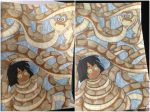 I did all the writing and then got a little bored LOL and moved on to the facing (right-side) page. While Googling to find the accurate colors for Kaa and Mowgli I found further proof that a lot of the images in the book are based off of stills from the movies themselves, as it is often quite easy to find reference images in nearly the identical scenarios. Case in point: Kaa’s face above…