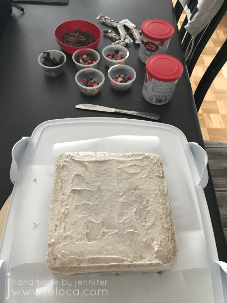 While the crumb coat is setting up, prepare your chosen candies and chocolates. As Henri’s birthday is in January, I used Smarties, Aeros and KitKats left over from Hallowe’en. Unwrap everything and crush up anything you want to use crushed (like my Aeros). You want everything ready and at hand while the next layer of icing is still wet, so it will stick well.