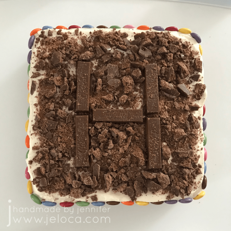 Finally, you can decorate the top. Use KitKat bars to spell out an initial or age and fill in the remaining surface with crushed Aeros. Pat down gently with a clean, dry hand to embed the little chocolate bits into the icing well, so they don’t fall off when you move or transport the cake.