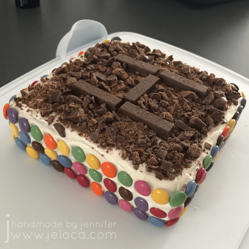 If you’re ever in need of a quick and easy cake decorating idea, do what we did for the family cake for Henri’s 9th birthday and cover it in candy! (Technically “chocolates”, though the Smarties count as both).