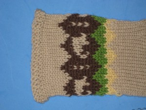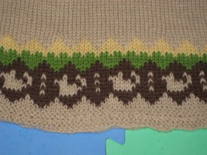 Modifications: The biggest would be that I redid the charts to have chinchillas in them. This gave me a 12 st repeat instead of 6 like the pattern, so I had to increase the st count of the body by 6 sts right before the Fair Isle section to accomodate my repeat. The numbers worked fine for the sleeves. I also used Oatmeal in place of the Chalk Blue ‘cus I’d used the blue for a swatch for another project.