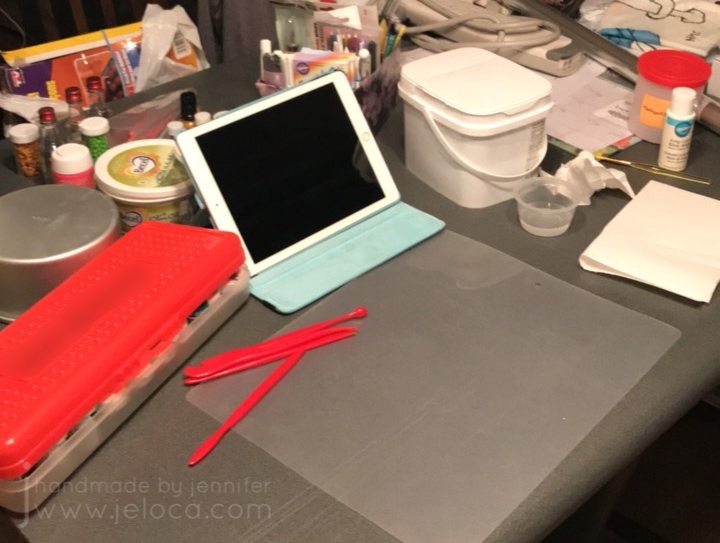 I always like to assemble my supplies before I start. There’s a tub of white fondant, fondant shaping tools, my organized container of tools, paintbrushes and edible markers, my collection of gel colors, water, mini vodka bottles (for fondant painting), paper towels for blotting, and most importantly – the cake tin I’d be using for the top tier (so I could scale my topper appropriately. Plus my iPad for both inspiration and entertainment while working.