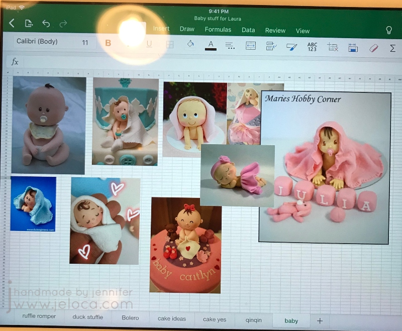 I always make an Excel file with inspiration samples. The goal is not to straight copy anything you find, but to have a sense of what’s possible. At the time I didn’t yet have a baby mold so since I’d be hand-sculpting I collected an assortment of toppers that looked like something I could do.