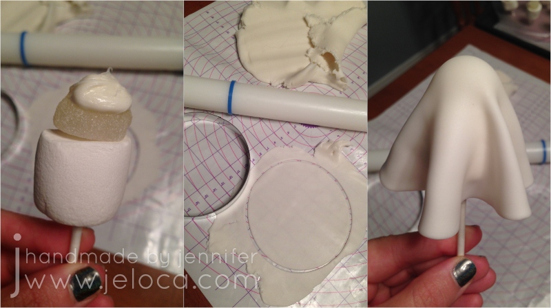 Push the lollipop stick up through a marshmallow and halfway into a gumdrop. You can wet the top of the marshmallow first with a thin smear of icing, clear piping gel or light brush of water to help the marshmallow and gumdrop adhere together, however I found that the tackiness on the stick from being shoved through the marshmallow did not make this necessary.