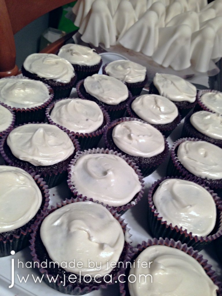 Repeat for each ghost and set them aside in your chosen support so the fondant can set up a bit. If desired prep a cake or cupcakes to be ready for the toppers. I’d baked up some chocolate cupcakes and gave them a thin layer of vanilla icing.