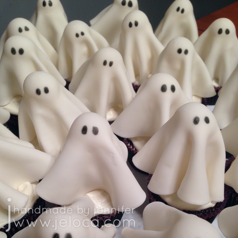 Repeat until all your ghosts can see and then set them into your cake/cupcakes (if using). If you are placing them into treat bags to give out as Hallowe’en favors, allow them to air-dry until the fondant sets up.