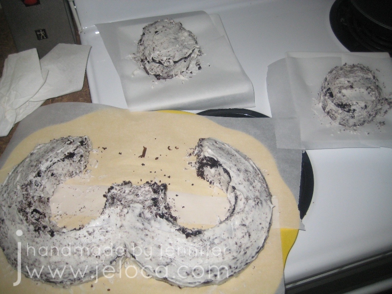 I forgot to take pics of the fries-making process, but you can find the full instructions at the Bakerella blog post. Basically you bake vanilla or sugar cookies (I used Betty Crocker Sugar Cookie mix) and bake the cookies as wide rectangles which you slice into “french fry” strips once baked and then toss in or sprinkle with granulated sugar to simulate salt crystals.