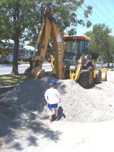 And COMPLETELY unrelated, here’s a pic of Jakob posing with his favorite vehicle. (What’s it called, by the way…back hoe?) We went to the dep for freezies on Saturday and they had one parked in the lot, and he was SO excited to get a chance to get up close and see it.