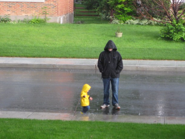 One time at the beginning of July it started POURING when we got home from picking Jakob up from daycare. The only way we could convince him to come inside to eat supper was to promise he could go back out and play before bed. He spent over a half hour swirling a long stick in the rushing puddles. They were both soaked down to the skin by the time they came in, but Jakob was so happy that it was worth it.