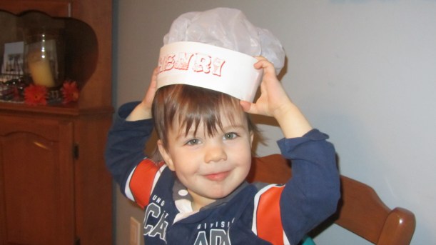 The bib was to protect his Habs jersey from getting dirty, and the personalized chef’s hat (a souvenir from a cooking birthday party) was worn for fun. Henri LOVES wearing stuff, whether it is the chef’s hat, a “love bug” paper crown with antenna he made at school for Valentine’s day, the stethoscope from a doctor’s costume, or even the small, yellow plastic glasses from Mr. Potato Head.