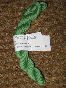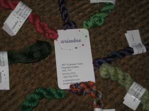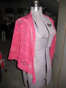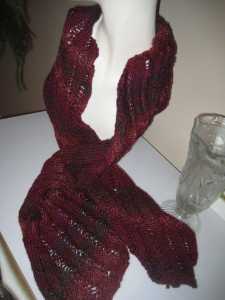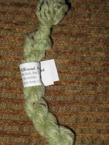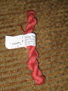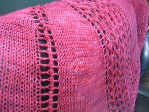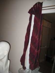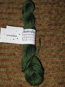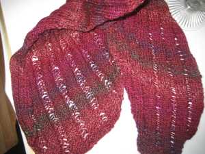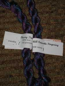 I really love the colors. The skein is upstairs and I’m feeling lazy, so I don’t have the colorway handy. I took the photos in sunlight without flash to try and get the colors as accurate as possible. They’re pretty close (on my monitor)- a deep gray-ish purple that fades through to a silvery mauve and is shot through with a soft moss green.