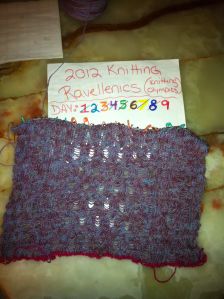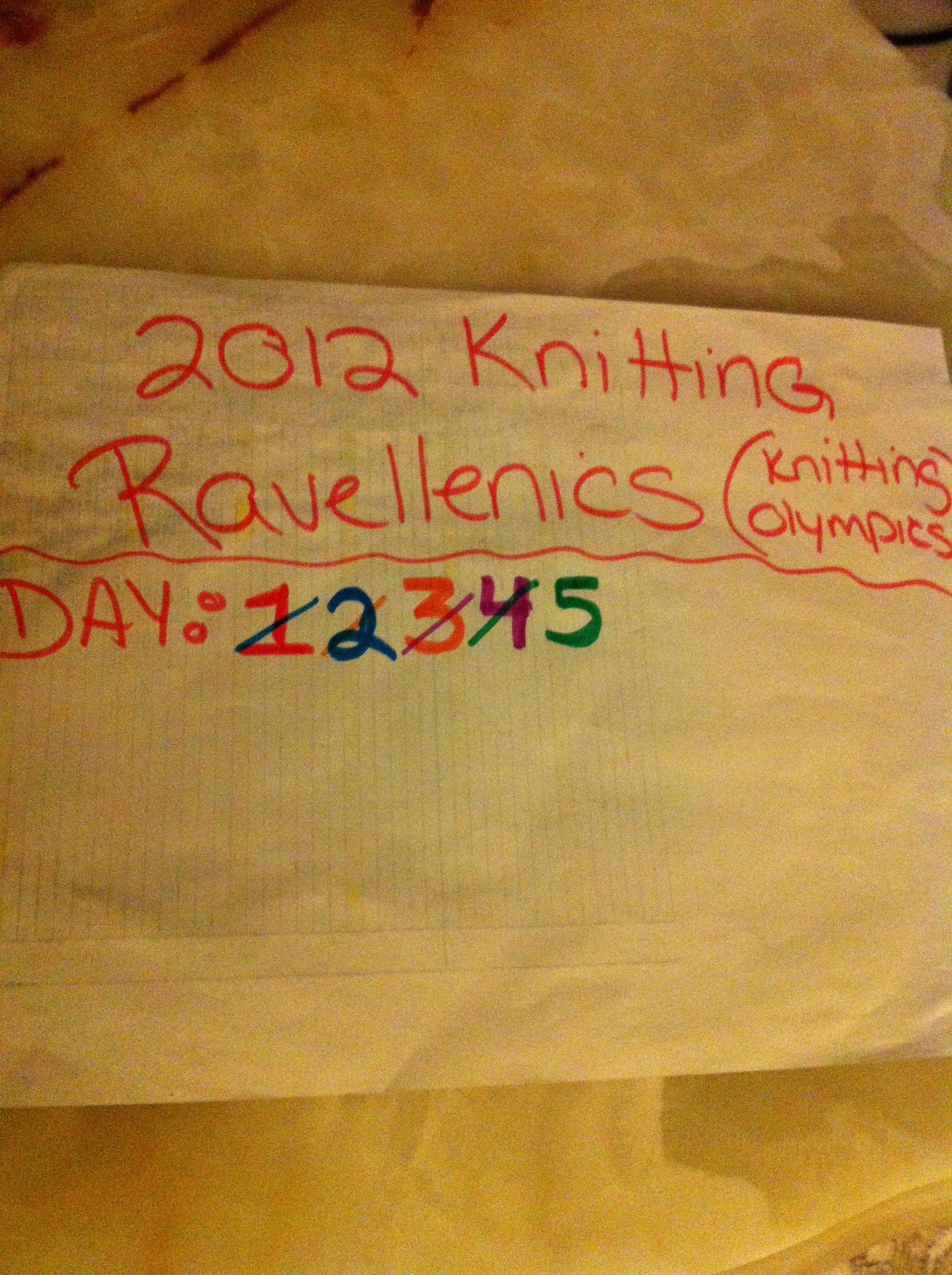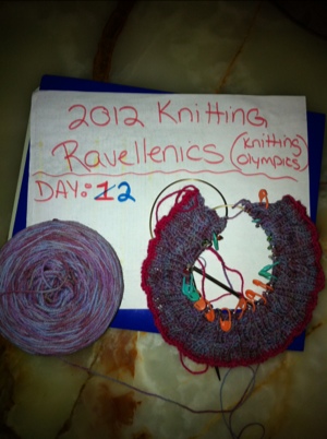 The bad news? To get 228 rows (the remaining 2/3) done by Sunday night (the closing ceremonies) means I need to knit 6.75 hours per day.