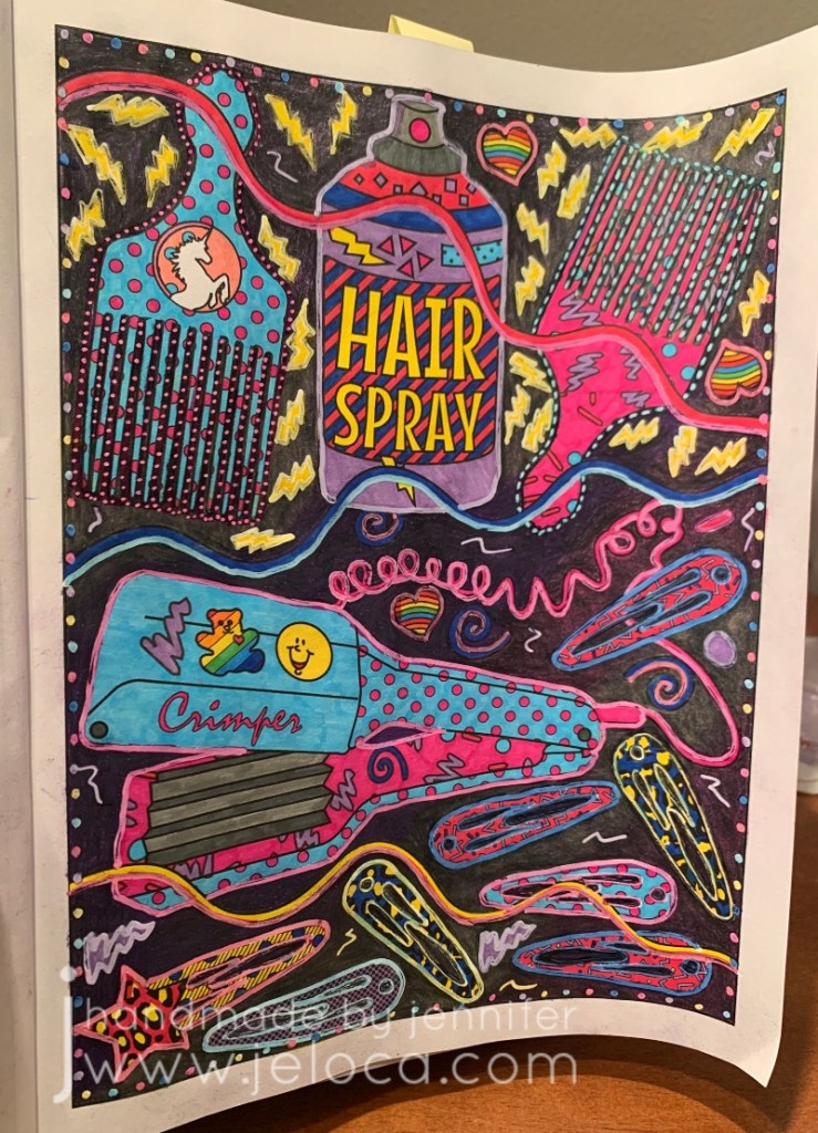 Looking back now I prefer the original background but at the time I’d felt it wasn’t bright enough to really SCREAM “80s”. I decided to outline everything (and also add random dots around the edge of the page for some reason…?) with a white Posca paint marker. These markers are great with colored pencils as they go over it beautifully without skipping, and once dry you can tint the paint with your markers or pencils.