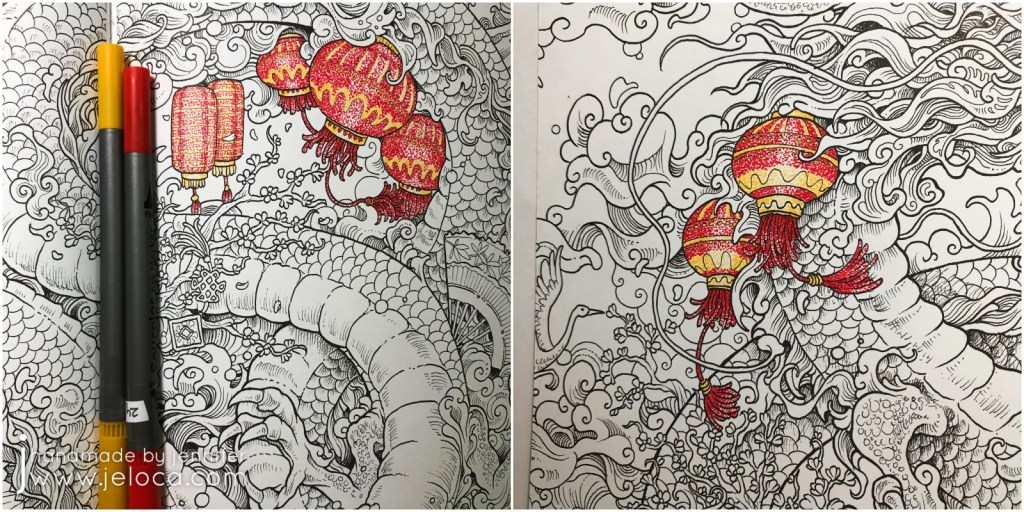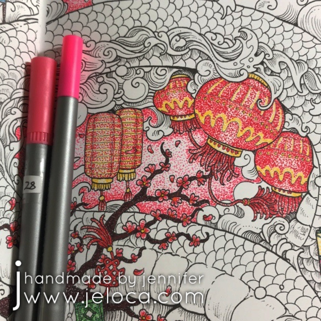 Next I used a brown marker to fill in both areas of cherry blossom branches and two shades of pink for the cherry blossom flowers and blowing petals. I completed the jade charm in the center of the above image and then used the original red and yellow to begin the firecrackers at the bottom.