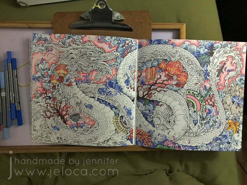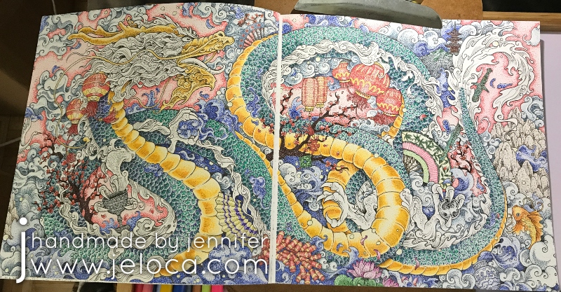 In celebration of today being “Circle Day“, I’m posting the process of coloring the Chinese Dragon page in Kirby Rosanes’ Mythomorphia coloring book.