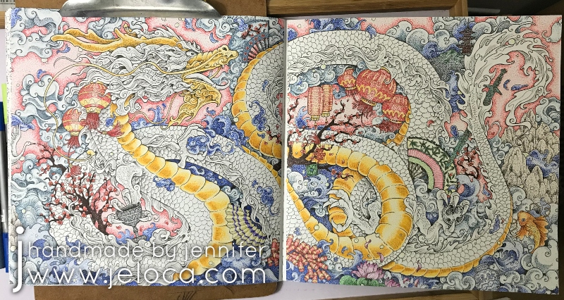 Sometimes, when pages are as busy as this, it can be difficult to tell what’s what. For example, I found myself needing to decipher if some curls were clouds or waves. To help visually distinguish individual sections I decided to begin filling in the background. I used two shades of pink and darkened the edges around each icon so that it would have a nice contract against the planned colors for the dragon, clouds and waves.