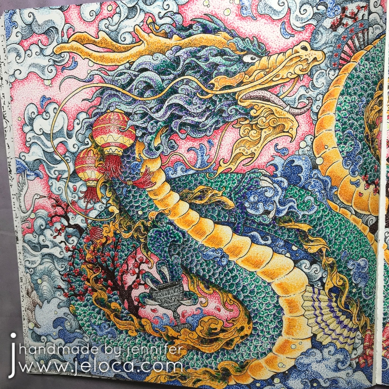 I kept going, making more itsy bitsy dots, until the entire background was complete leaving only the central, most important image of the page: the dragon.