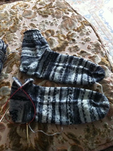 I’d like to finish Yannick’s black & white socks. Last night I snuggled in bed with my knitting and laptop, and watched the latest episode of Supernatural. Now the socks look like this: