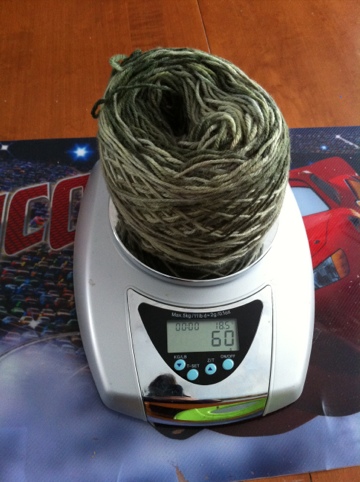 Finally, to be safe, I weighed one of my current socks that I’m wearing- a hand-knit, toe-up, shortie sock (1″ stockinette before 1″ of ribbing), and it only weighs 24g. So I know I’m safe to make a pair from my leftovers.