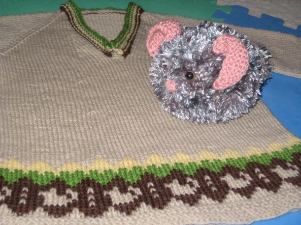 Modifications: The biggest would be that I redid the charts to have chinchillas in them. This gave me a 12 st repeat instead of 6 like the pattern, so I had to increase the st count of the body by 6 sts right before the Fair Isle section to accomodate my repeat. The numbers worked fine for the sleeves. I also used Oatmeal in place of the Chalk Blue ‘cus I’d used the blue for a swatch for another project.