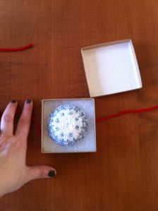 So I did.  I used crochet thread and a very small (1.25mm?) crochet hook.  The white was one thickness but the blue was thinner so I held it along with a white/silver strand, not that you can really tell from these photos.  I made up the pattern, both the increase rate and the colorwork, as I went along, and stopped when it “seemed about the right size”.  I think it was roughly 3″ across.