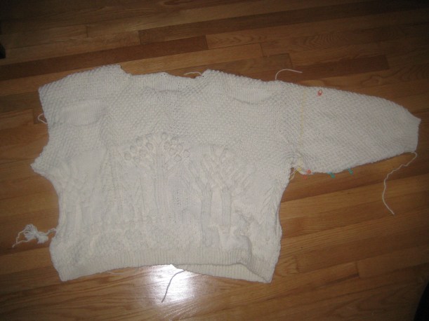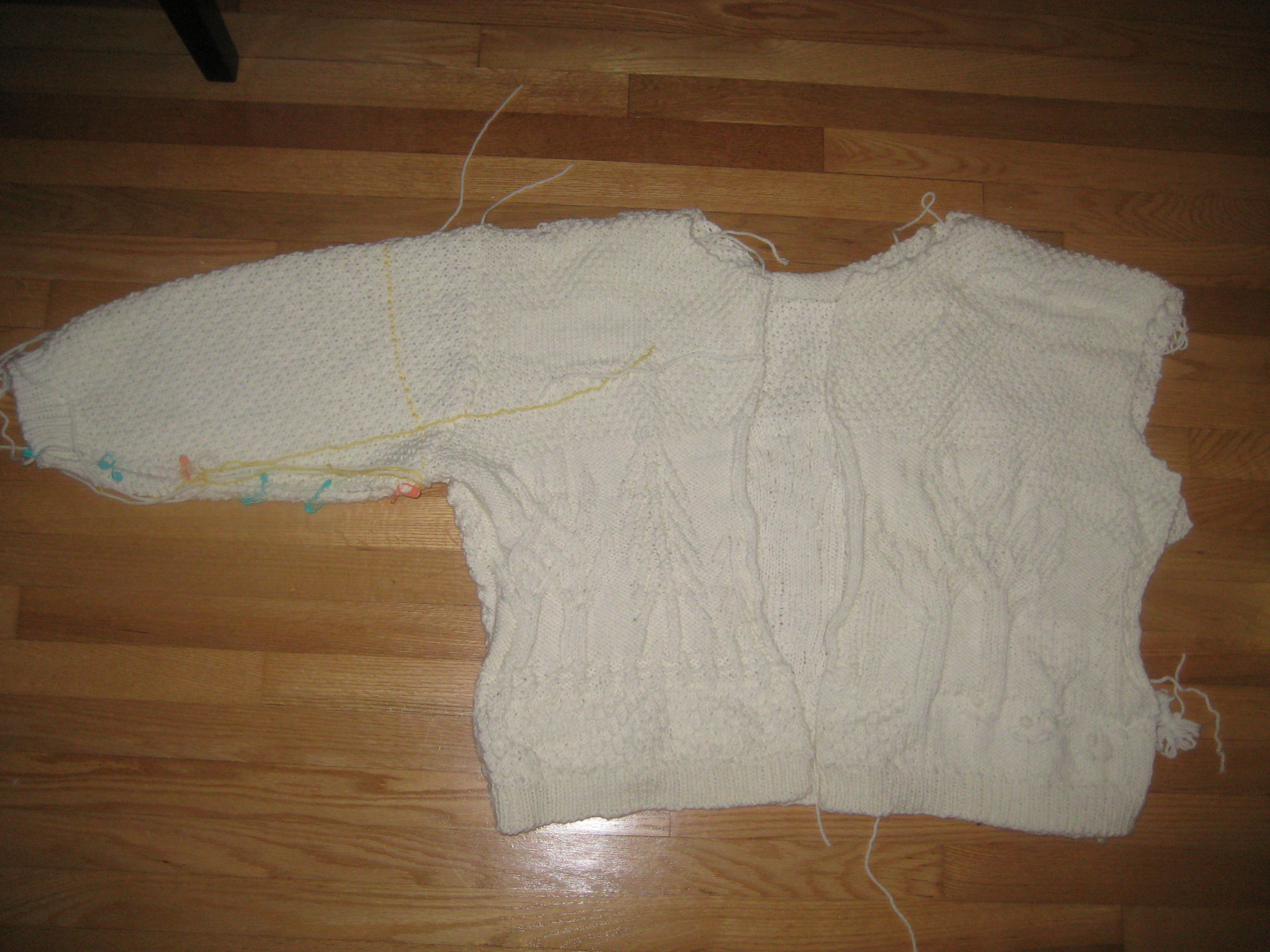 Here’s the back of the cardi after I’d seamed in the sleeve and the side seam.