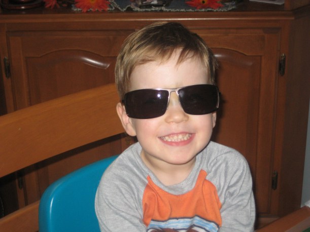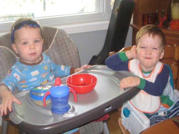 Here are the boys last month sometime. Henri loves wearing stuff on his head…hats, glasses, etc. That’s a pair of sunglasses he’s got on there. Jakob is always pulling Henri’s chair over to feed him or swipe food off his tray.