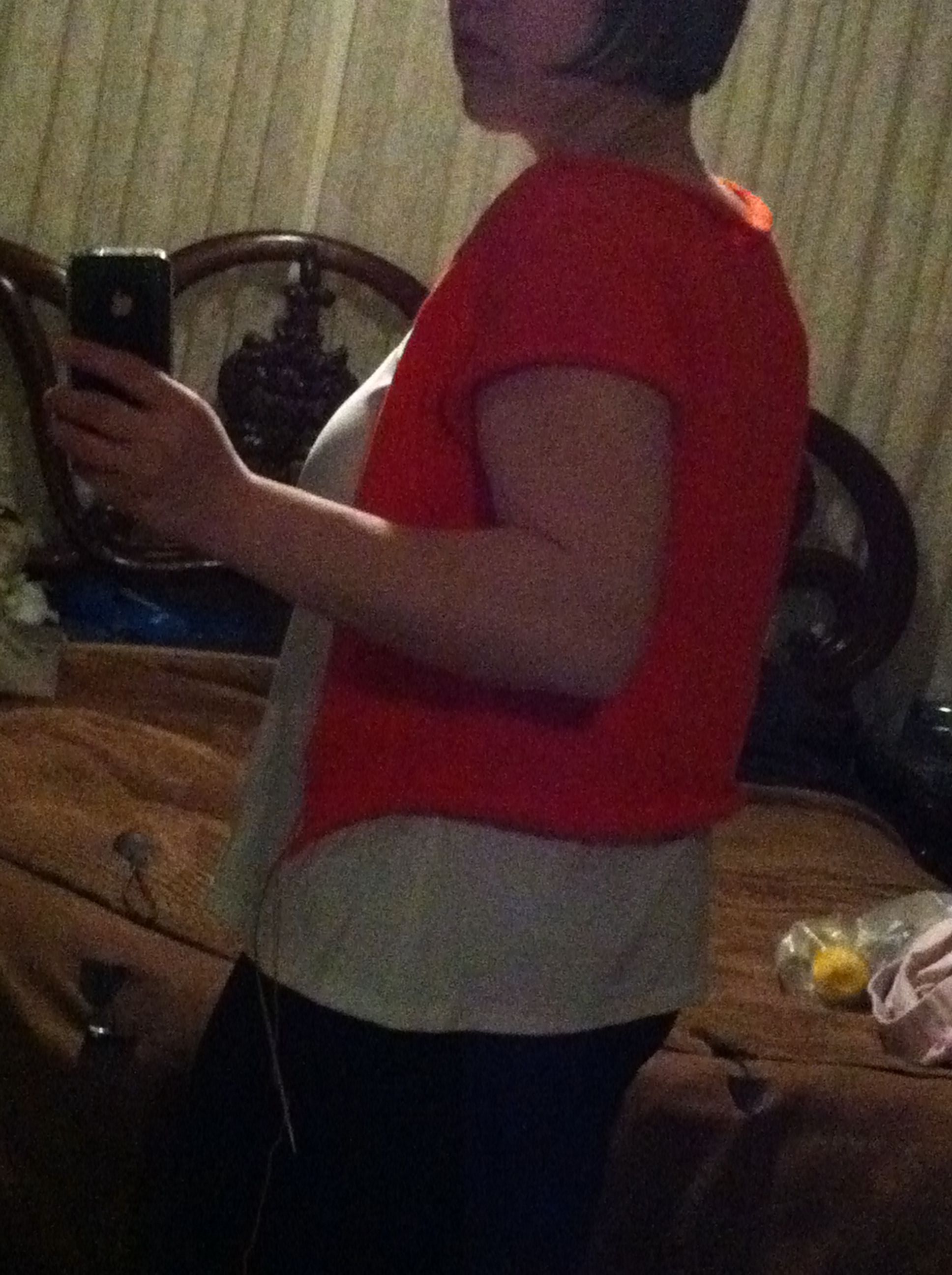 It’s really coming along! I think I’m going to keep going until it’s about an inch longer than my white tank top, then move on to the border then the sleeves. If I have enough yarn then I’ll make them about 3/4 length, otherwise it will be short-sleeved.