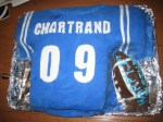 The cake was only my second or third attempt at using fondant, so looking back on it now, I cringe, but at the time I was pretty proud.  I’d tinted white fondant to as close a match to Colts blue as I could and then cut a huge cake into roughly a jersey shape.  White fondant was used for the accents.  I remember being afraid to trim the edges and have cake show through underneath so I’d left them look ‘messy’, hoping it would appear like rumpled fabric.  Heh.Photo 2014-01-17, 6 57 19 PM