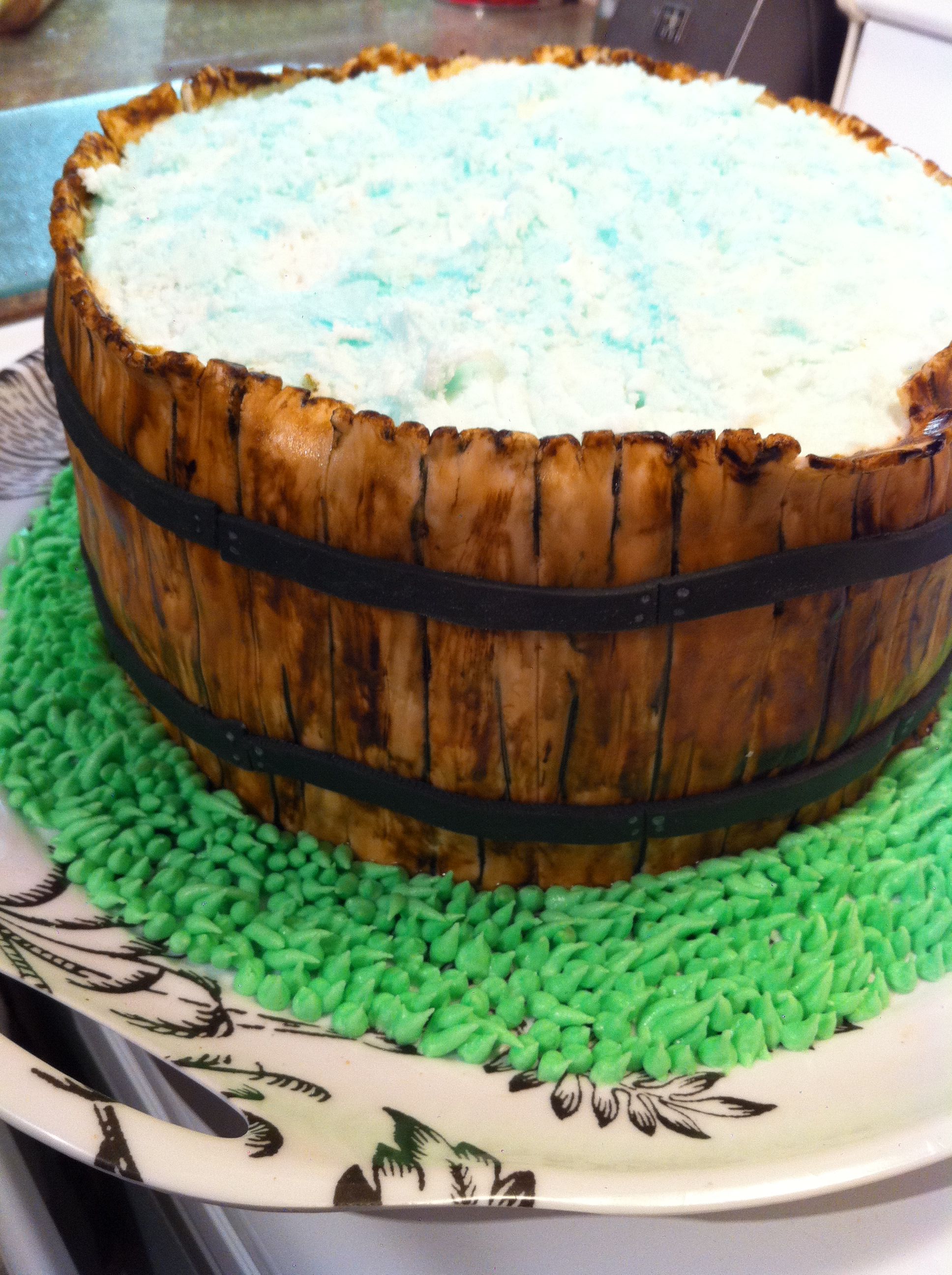 Once the icing had crusted over I went back over it with the blue icing, mixing the two with my knife as I went, and chopping it up a bit so it looked frothy and bubbly. Then I sat down to do the wood grain.