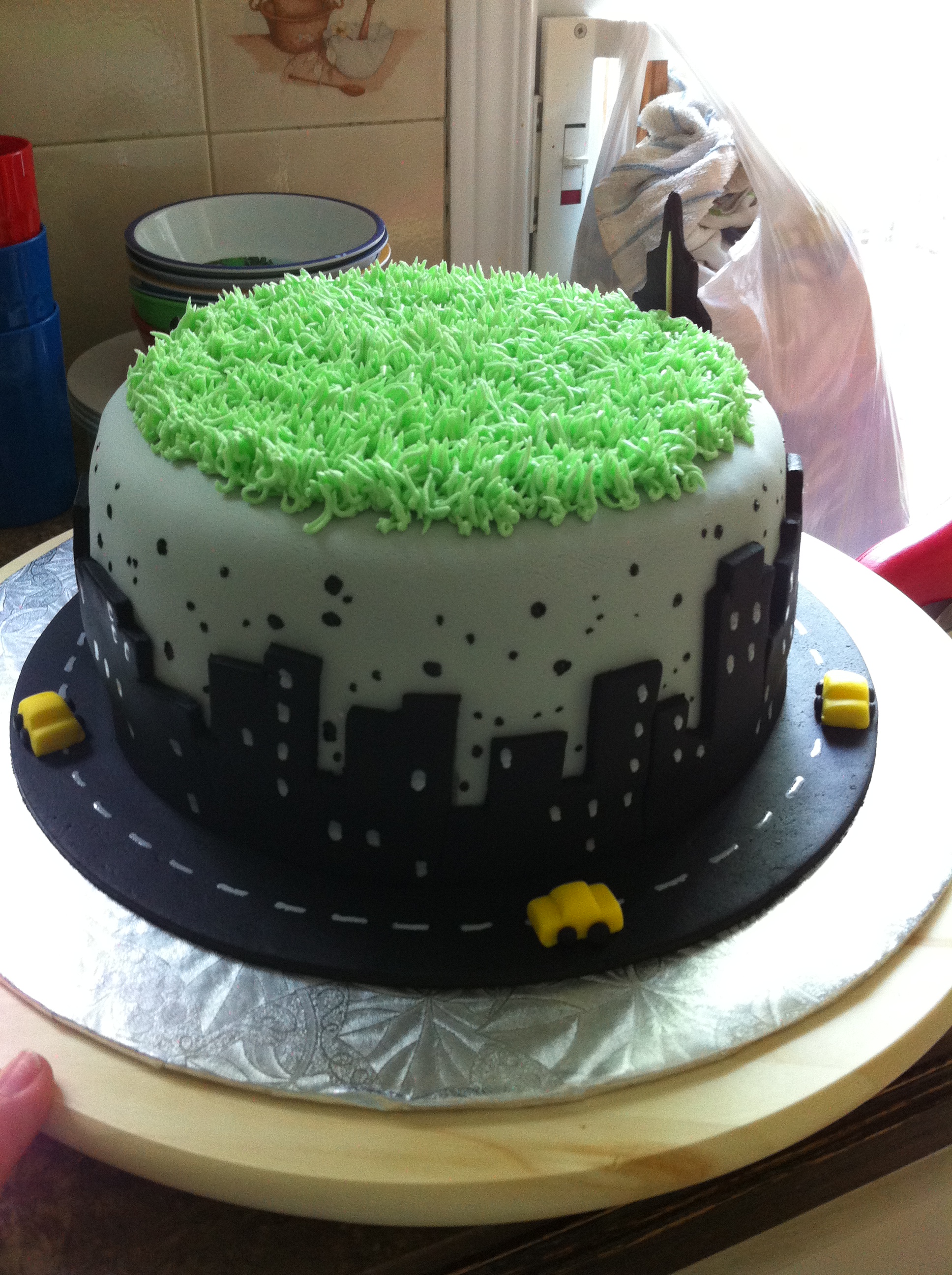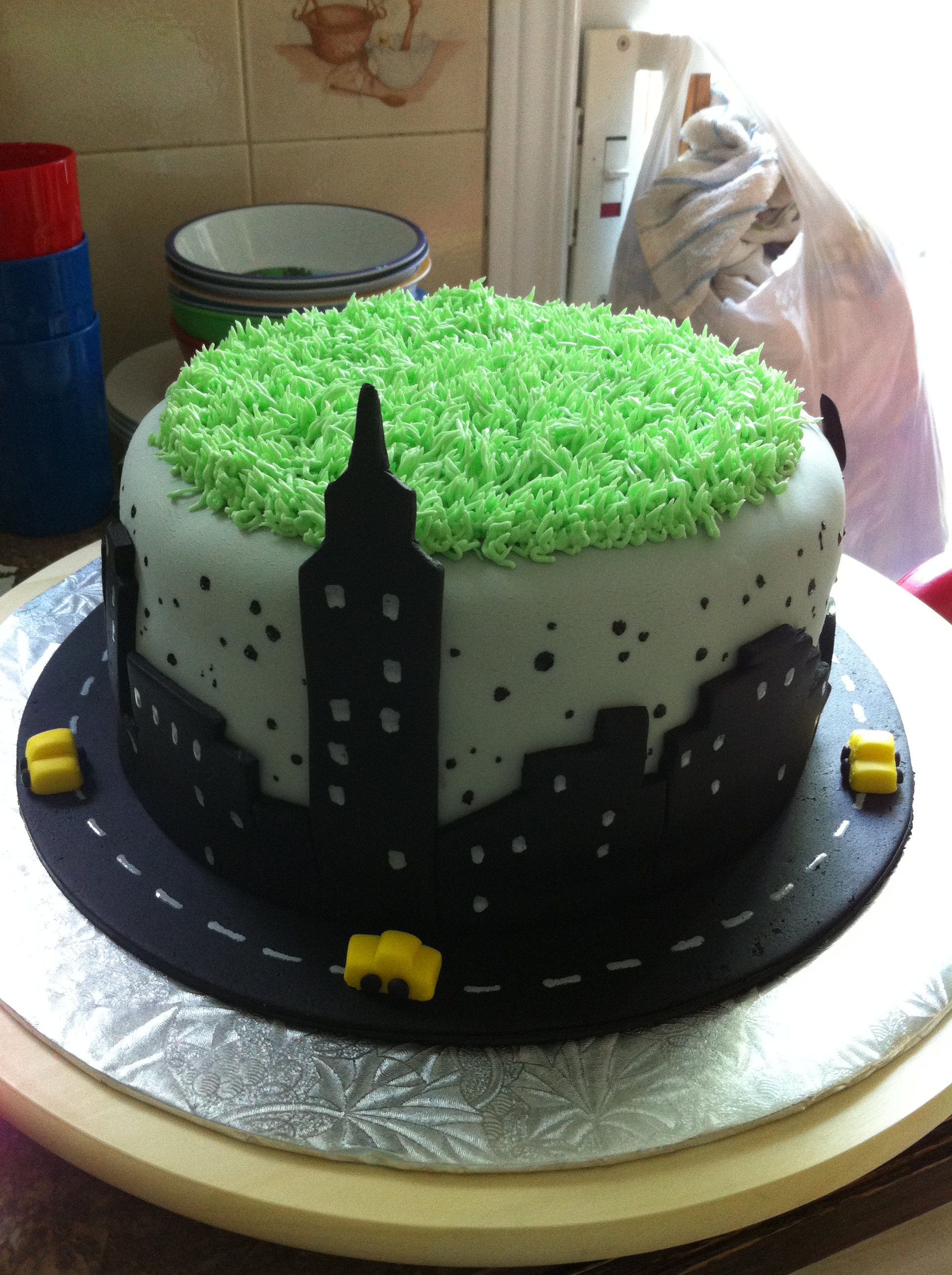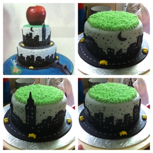 I bought pre-tinted black fondant and rolled out a thick disc to set the cake on, then rolled out some strips the height of my tallest building. I eyeballed the building placement, going off the sample pic and just tried to make sure I had some variation in heights for interest. You can see in the pic below that I used a toothpick to support the tallest building. I cut out the buildings in groupings of 2-3 and ‘glued’ them around the cake with a bit of water. I stuck them on after setting the cake in place, so I could make sure to butt them down as low as possible to the ‘road’.