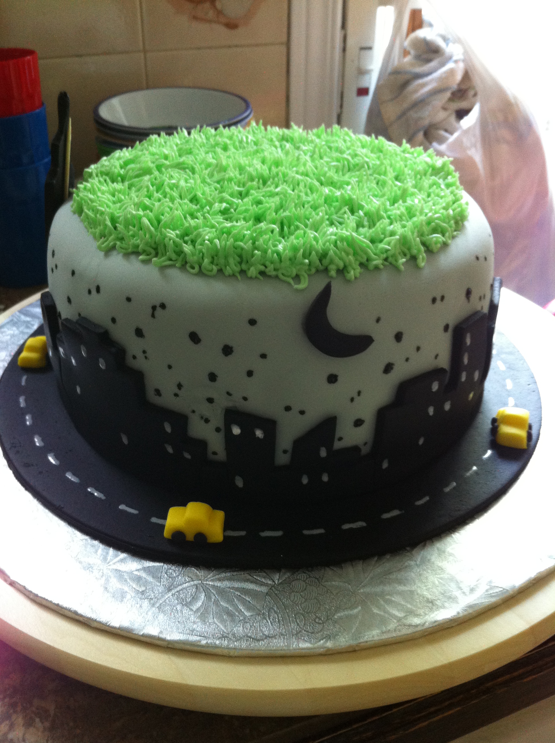 I thinned some black food gel and dotted the ‘stars’ around the sky, and used Wilton whitener for the road markings and the ‘windows’. Sadly I didn’t think to thicken the whitener with a bit of icing sugar, so it paled considerably once dried, and I had to do a second coat on most of them. To make the adorable taxis I tinted some white fondant yellow and shaped it into a rectangular brick. I cut off the outside corners with a sharp knife then sliced the resulting “T” shape into car-appropriate widths. The wheels are tiny flattened disks of black fondant, everything ‘glued’ together with a bit of water.