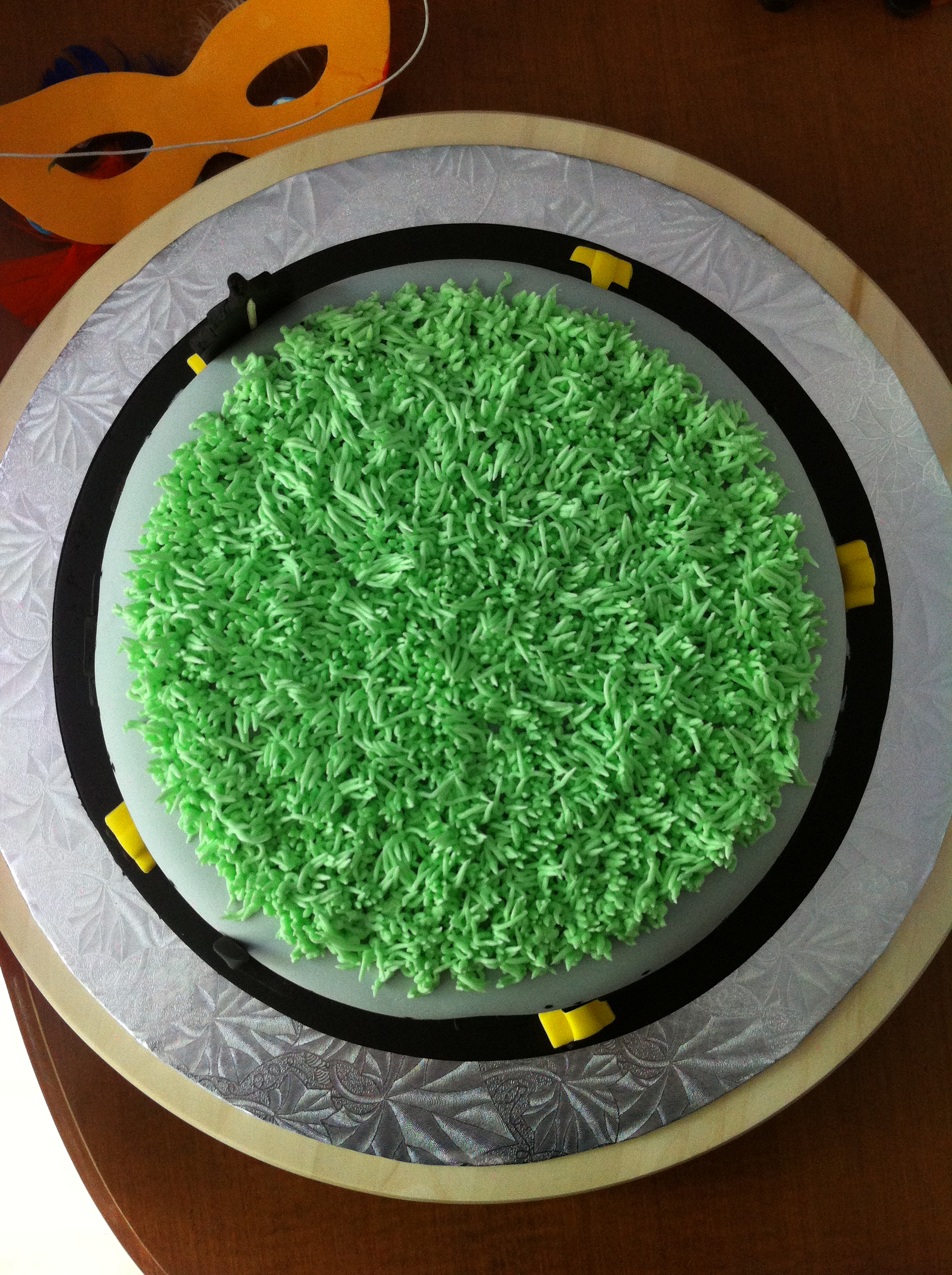 The last thing to do was the grass for the top. I knew they’d be adding the apple on-site, but making a green fondant disk felt too easy. I had leftover buttercream so I tinted it green and hand-piped the blades of grass with a piping bag and multi-holed icing tip.