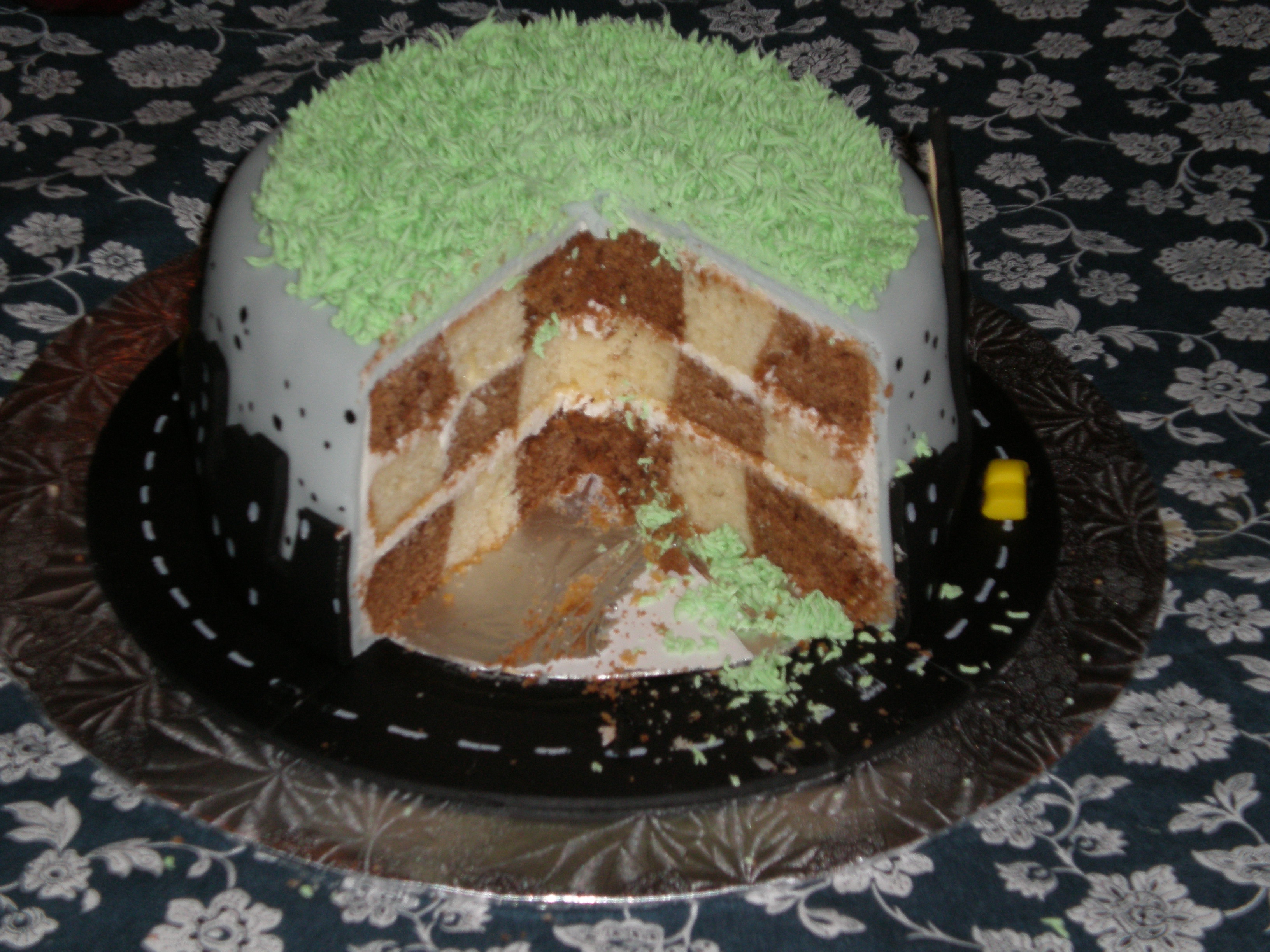 I later received this pic from the woman who’d bought the cake. I love seeing the inside, seeing that the checkerboard lined up properly! 😀