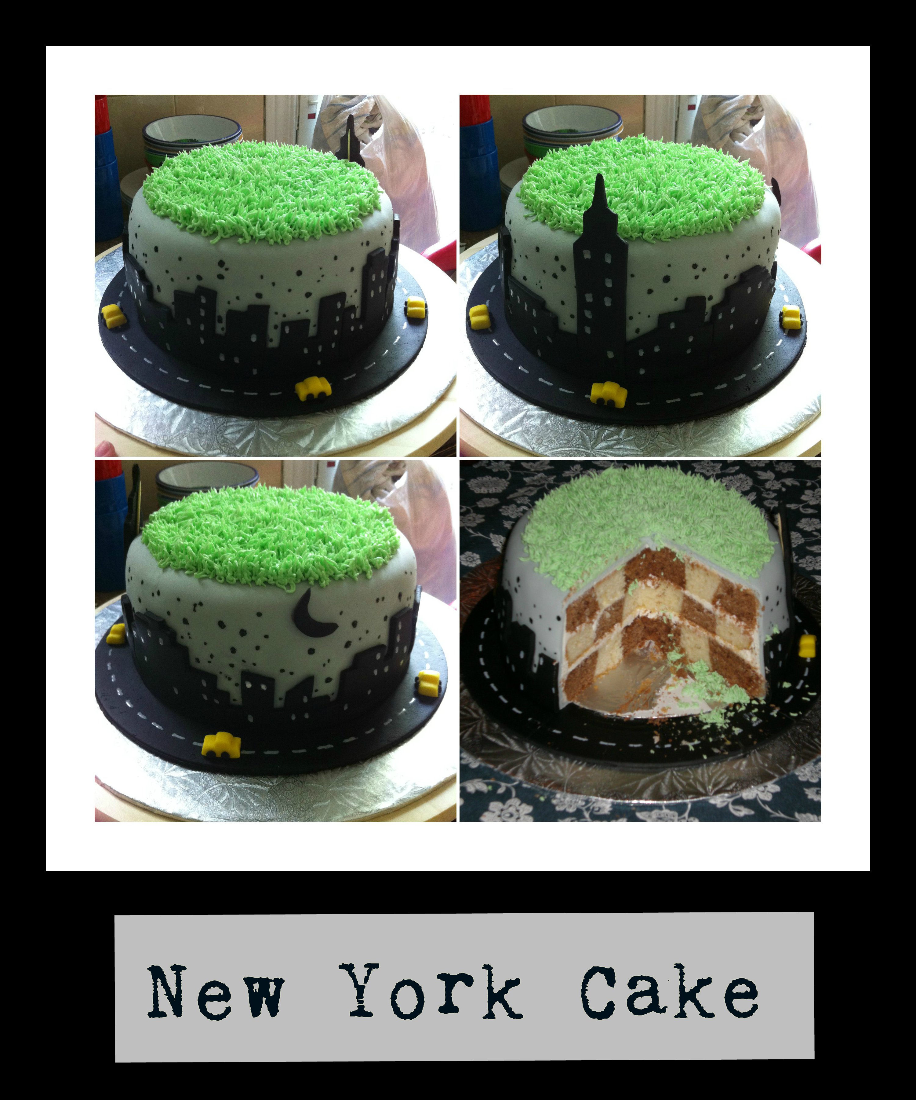 I decided to build it up with a checkerboard cake, partly because I needed the height from the three layers to fit the skyline, and partly because I loved the idea of a New York-themed cake having a taxi cab-esque checkerboard on the inside. (It’s deliciouser on the inside. Heh.)