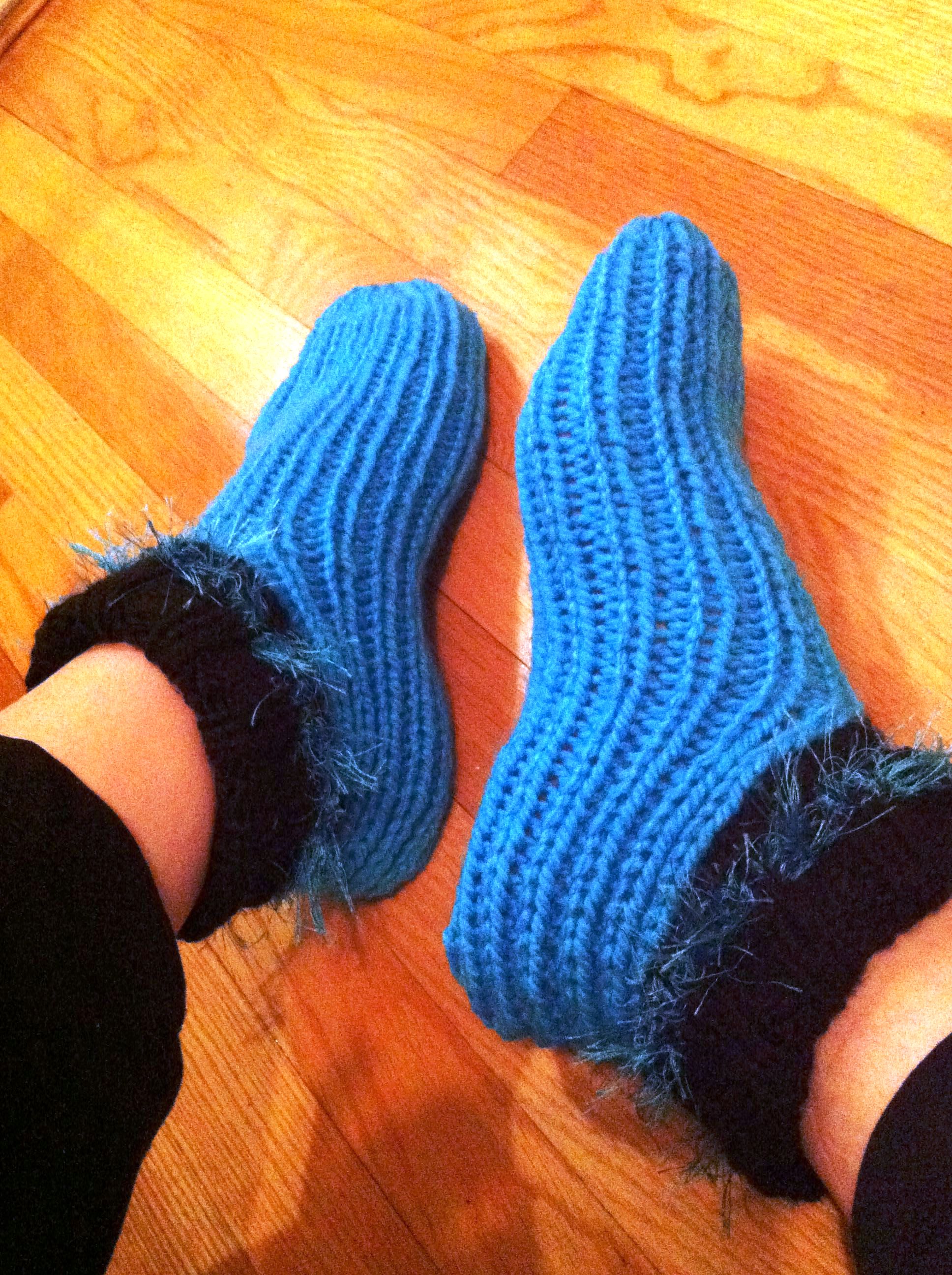I used some no-name chunky yarn in the teal color, the stuff I’d recycled from the failed crochet deep v vest.  I still think it’s Bernat Softee Chunky.  The black is Bernat Pounder worsted yarn, and I carried along some teal LionBrand Fun Fur for the last 4 rows, then bound off in the black only.  I’d only had a small amount of the fur yarn, so I divided it in 2 and just did as many rows as I could in each sock.  I used 5mm for the foot, and 4mm for the cuff.  It’s a free pattern, I forget the source right now, but if you search for them on Ravelry you’ll find them.  (Something is making me think they’re a free Interweave pattern, but I won’t swear by that).