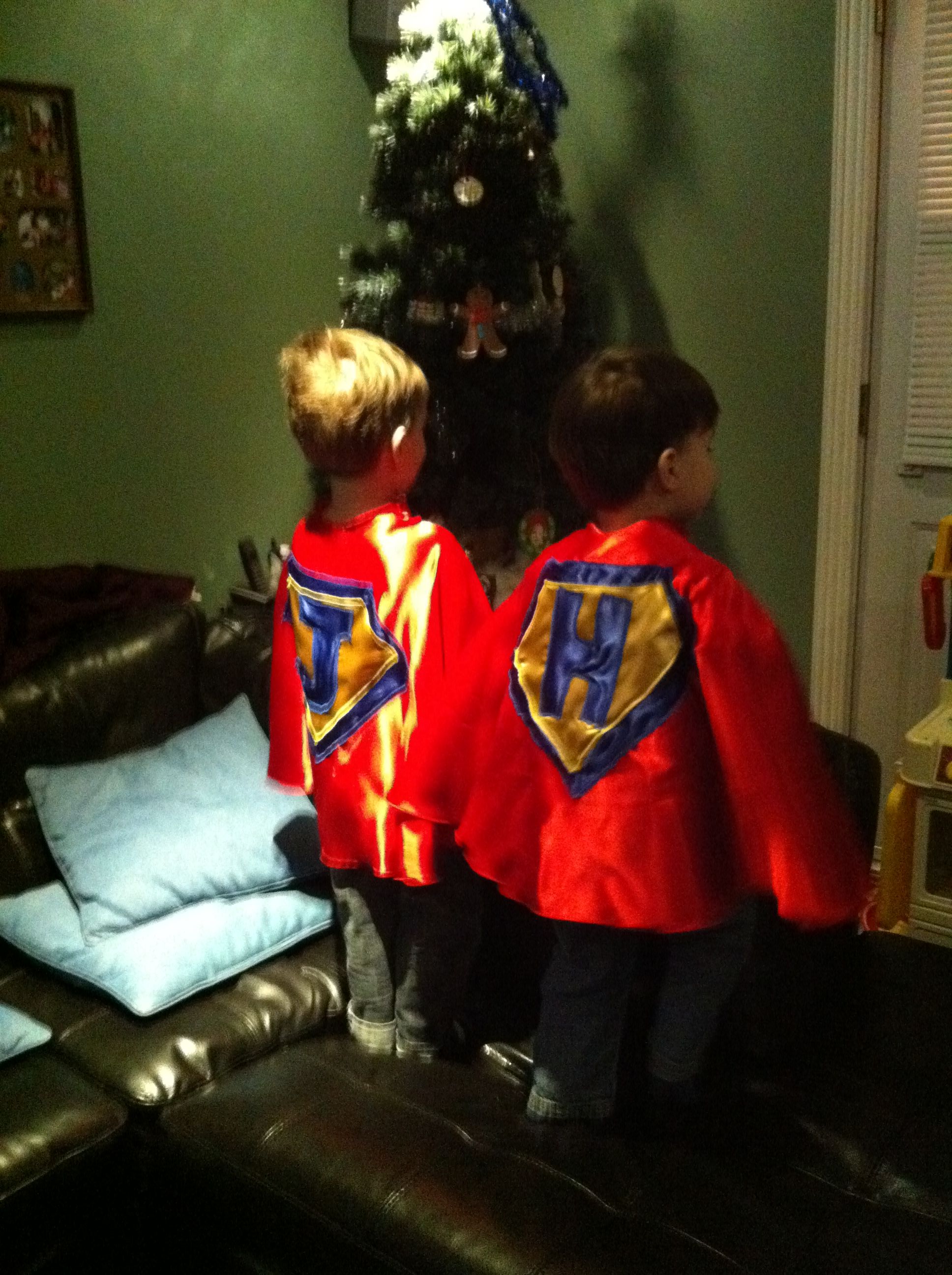 Aren’t those capes awesome?!?  She made them herself, and they are absolutely everything a young superhero could ask for.  They originally had a lukewarm reception, as I’d expected since my boys are not good with change.  But a few days later suddenly the capes were all they could think about.  Seriously, you have no idea how hard it was to get this photo- every other pic I took was very much an “action shot”.