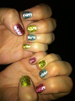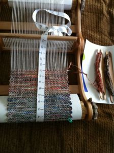 I figured it would be a good idea to have a group pic of all the yarns used in my sparkly woven blanket before they were used up in the blanket. Because I’m striping them randomly it’s not easy to tell from the project what the yarns that went into it looked like, so this will be my reminder.