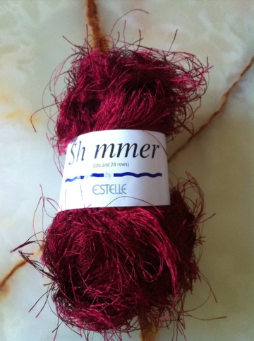 #5 is my fun fur contribution, Shimmer by Estelle. I used to collect fun fur for trims on the dog sweaters I used to sell, and I think I’d bought this from my lys for that purpose before I realized how unprofitable it was. Color 738 (deep wine color), and 100% polyester.