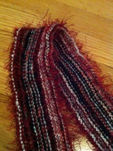 Last night after finishing MY scarf I slowly ripped back the last row of live sts- a fun fur row…making this not much fun at all. Still, eventually I had all 264 sts back on my needle.